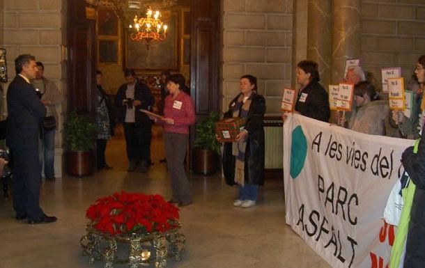 Al lliurament d’aquestes signaturas hi participen una vintena de persones amb pancartas en les quals es poden llegir motius diversos pels quals es considera necessari el parc.